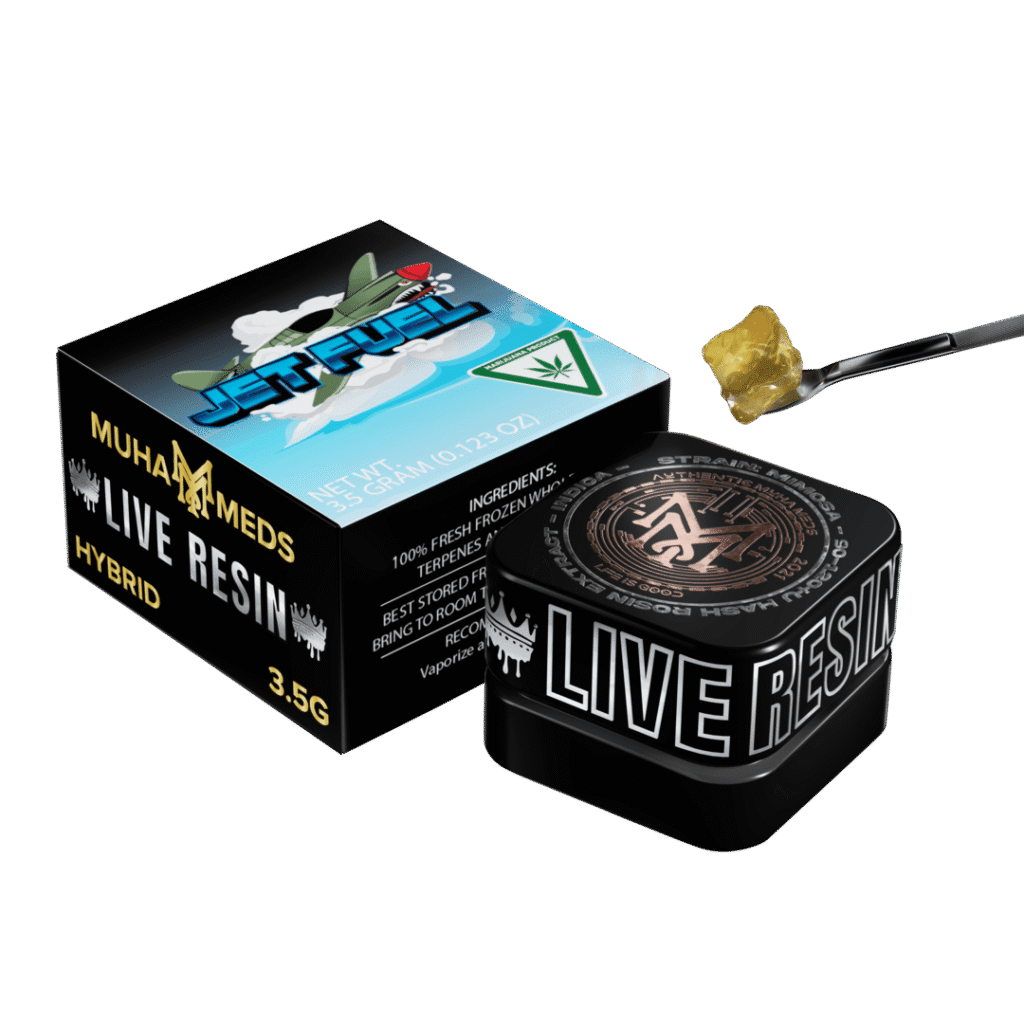 Jet Fuel is a hybrid strain renowned for its uplifting effects that may alleviate anxiety. Jet Fuel is the perfect fusion of top-tier Diesel strains, resulting from the marriage of Aspen OG and High Country Diesel. The name ‘Jet Fuel’ doesn’t just refer to its sweet and pungent diesel aroma but also signifies the high-energy burst of uplifting effects it provides. These effects gradually transition into a dream-like state of relaxation, making Jet Fuel a compelling choice for those seeking a well-rounded live resin experience.